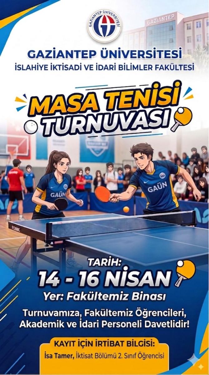 2025-2026 Eğitim-Öğretim Yılı Bahar Yarıyılı etkinlikleri kapsamında İslahiye İktisadi ve İdari Bilimler Fakültesi bünyesinde bir masa tenisi turnuvası düzenlenmesi kararlaştırılmıştır.